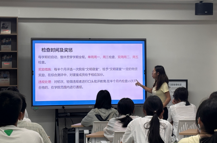 会议伊始,院员工会主席团成员章琦同学聚焦寝室管理要点进行细致讲解:在文明寝室评分标准层面,她将寝室评分细则拆解为地面清洁、物品摆放、内务整理等具体检查项目,逐项明确评分维度与扣分规则;在工作流程层面,她系统梳理查寝工作规范,从查寝频次的科学设定、查寝人员的分工协作,到检查记录的留存要求,均进行了全面细致的说明,为新学期寝室管理工作的标准化推进、常态化落实打下坚实基础。